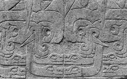 Sobre las cuatro caras de este obelisco están tallados los dibujos de 2 lagartos: macho y hembra, quienes habitan cada cual en una mitad del universo. Ellos expresan su poder en la tierra a través de mensajeros, como el jaguar o el águila.